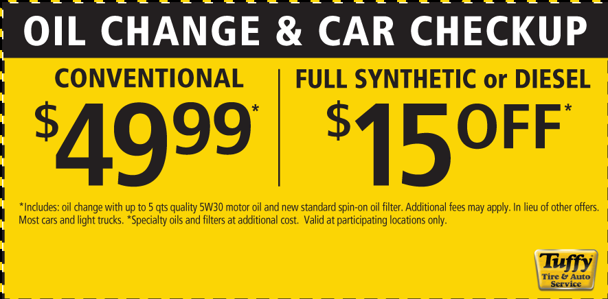 Good only atTuffy South Clermont Expires 04/15/26 Schedule Service Print coupon Share to Google Share to Facebook Share to Yelp Offer details Oil Change Conventional $49.99 Full Synthetic or Diesel $15 OFF * See coupon for exclusions. Email Coupon First name * Last name * Email address * Sign me up to receive future offers via text from Tuffy South Clermont: Via Text Cell/Mobile Phone By clicking "I accept" below, I expressly agree to receive marketing text messages made by or on behalf of Tuffy South Clermont to the telephone number(s) I’ve listed above. I understand that I may receive such text messages by the use of Automatic Telephone Dialing Systems (including “Predictive Dialers” or “Autodialers”) and I agree to receive them even if I have registered my number(s) with my state or federal Do-Not-Call list(s). I understand that such text messages will include advertising containing offers for goods or services and that I may revoke this consent at any time by telephone, return text message or by Visiting tuffysouthclermont.com/stop to unsubscribe. Message and data rates may apply. I also understand that I am NOT required to provide this consent as a condition of purchasing goods or services. I accept View: Text Specials Terms and Conditions with this link.